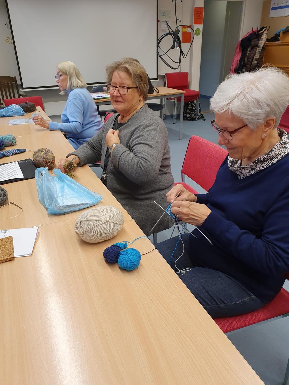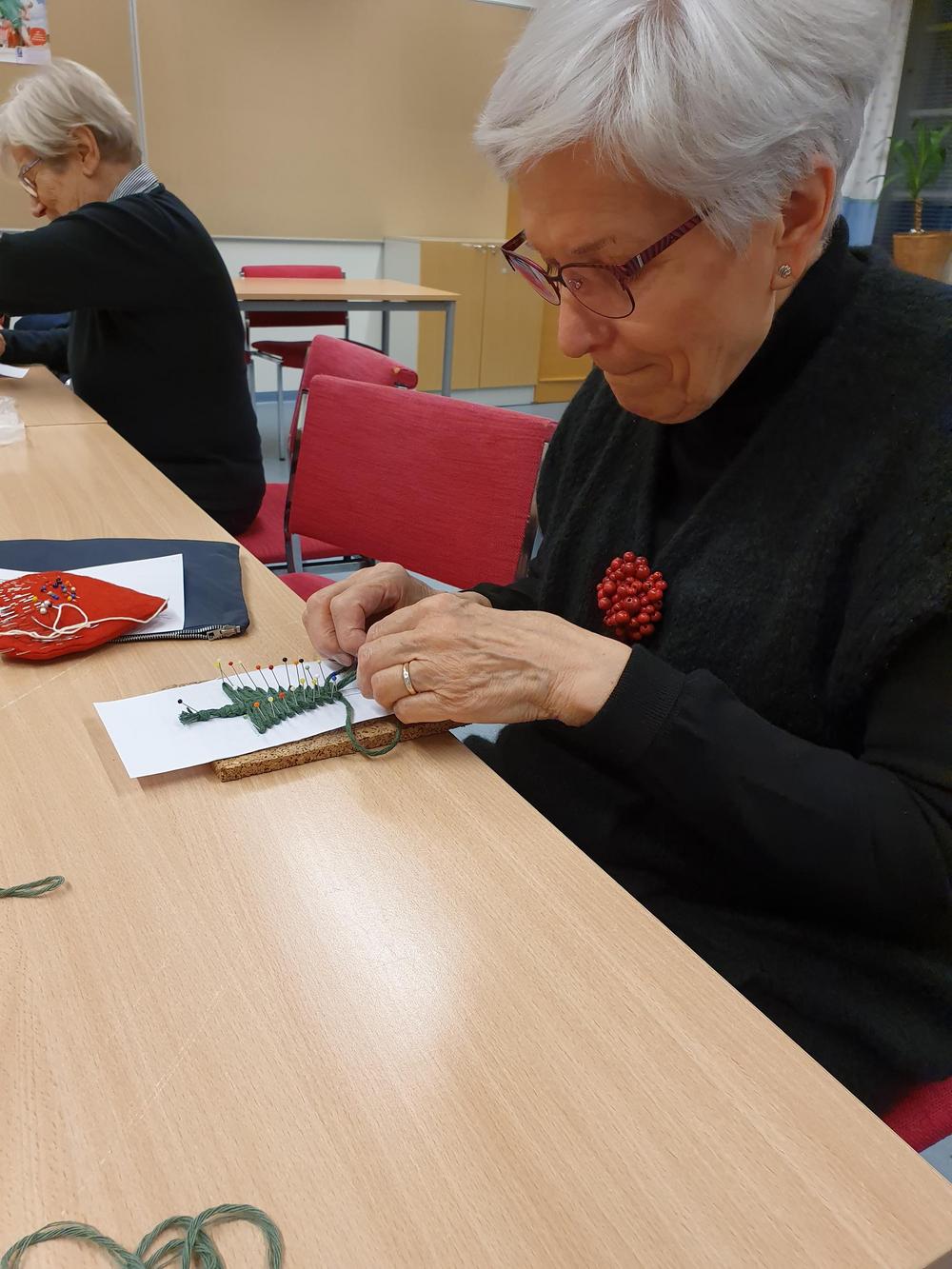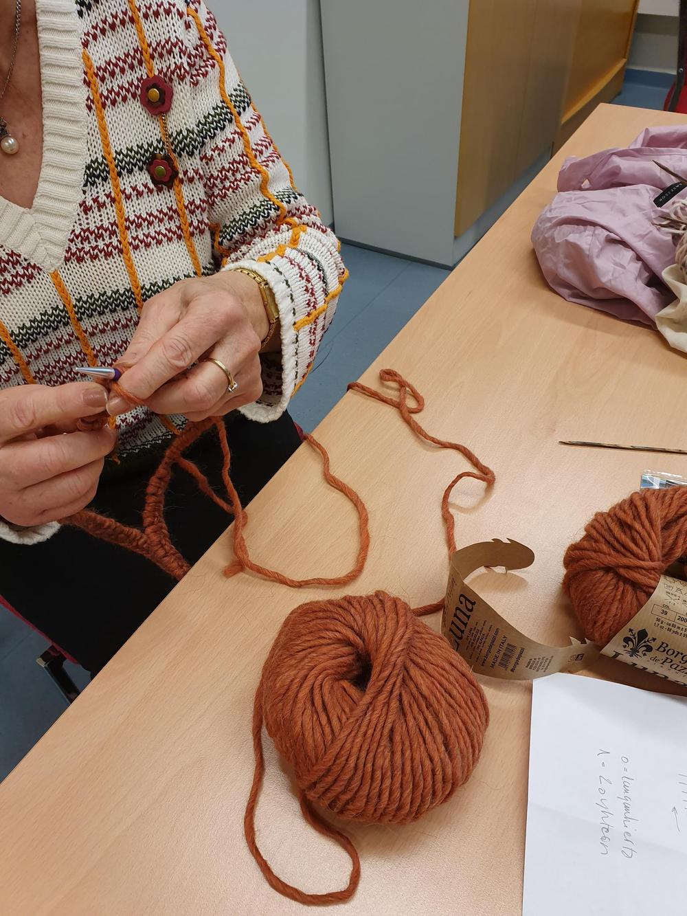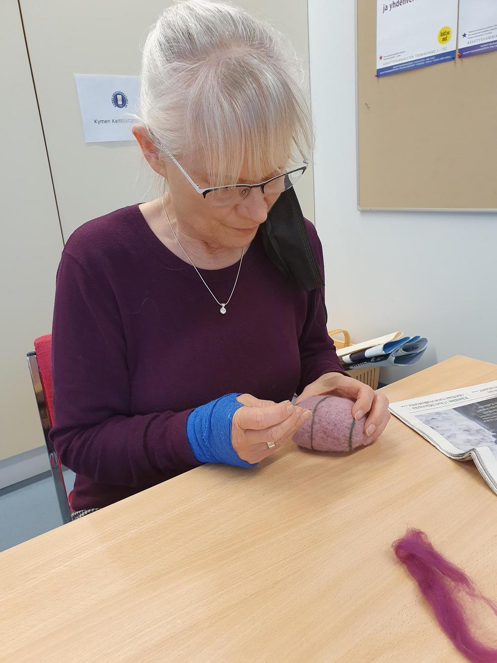 Tuokiokuvia käsityökerhosta 4.10.2021 kumppanuustalo Viikarissa: valmisteilla on käsitöitä joulumyyjäisiin ja joululahjaksi.