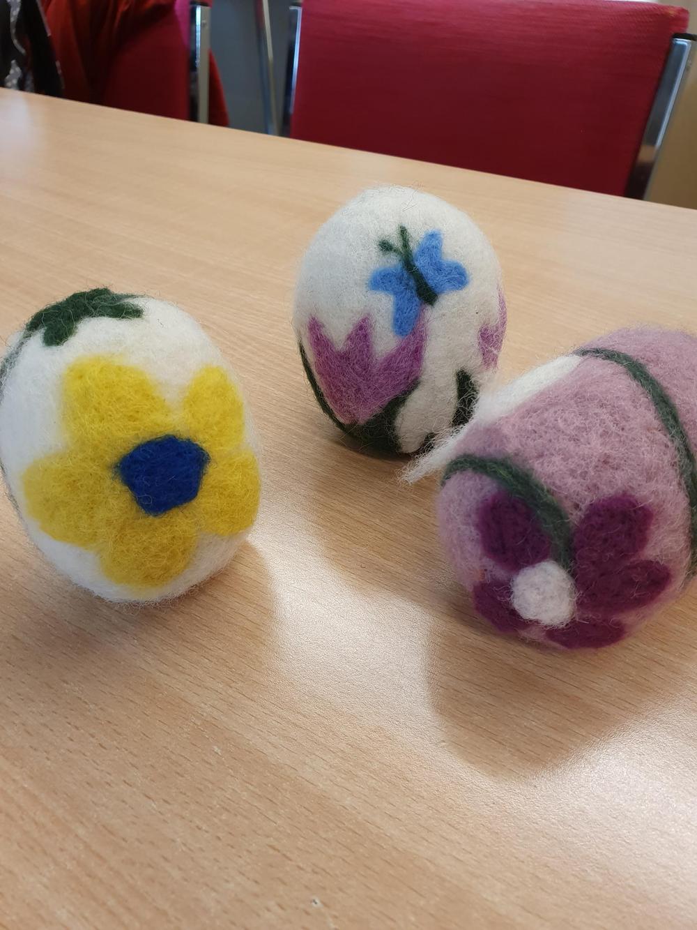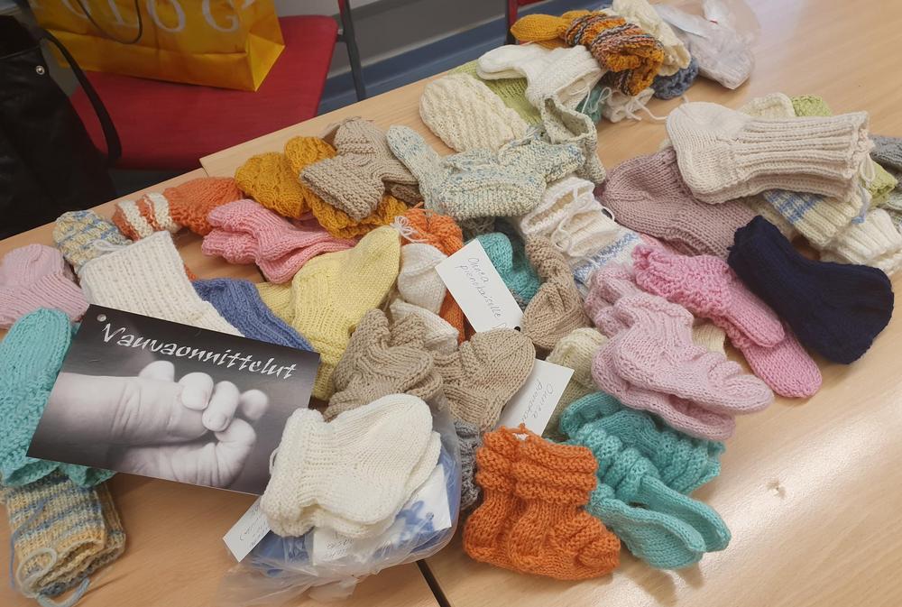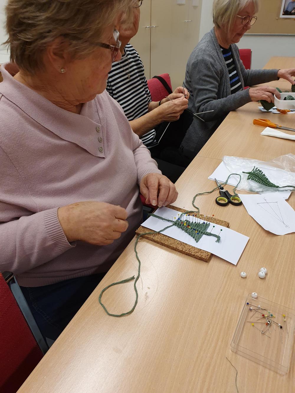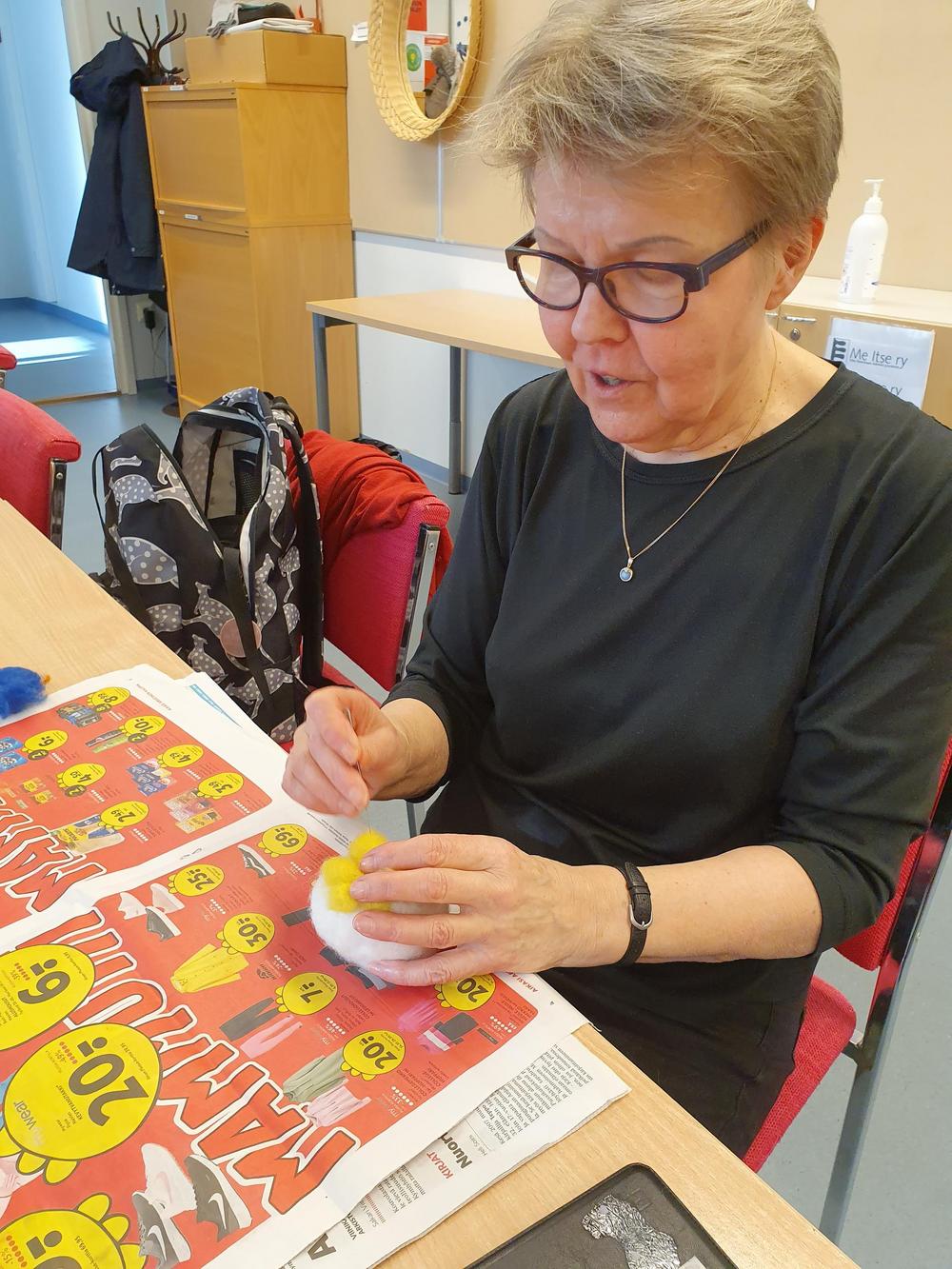 Tuokiokuvia käsityökerhosta 4.10.2021 kumppanuustalo Viikarissa: valmisteilla on käsitöitä joulumyyjäisiin ja joululahjaksi.