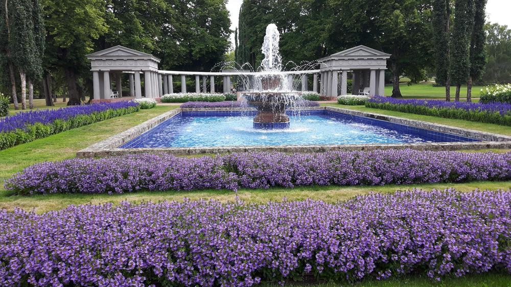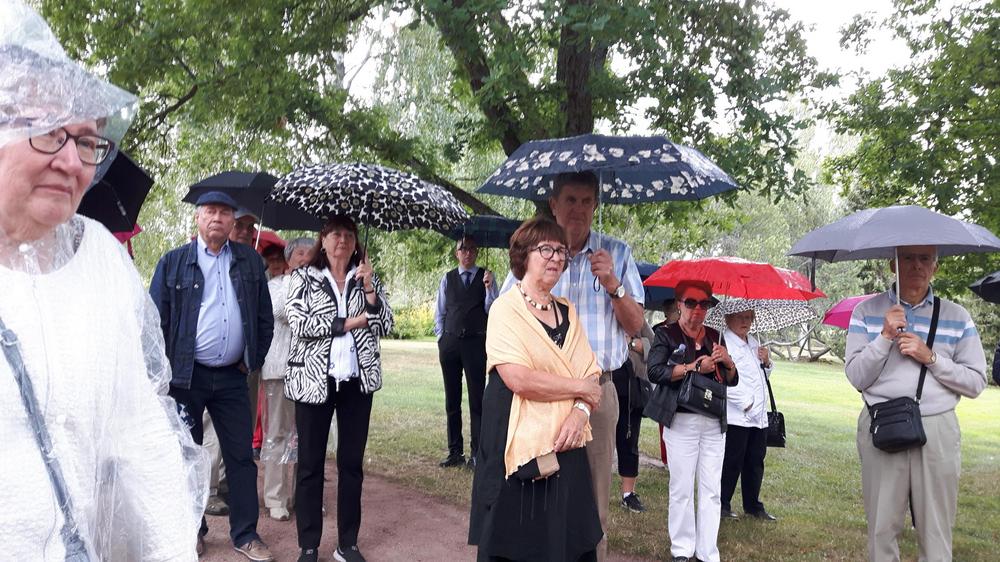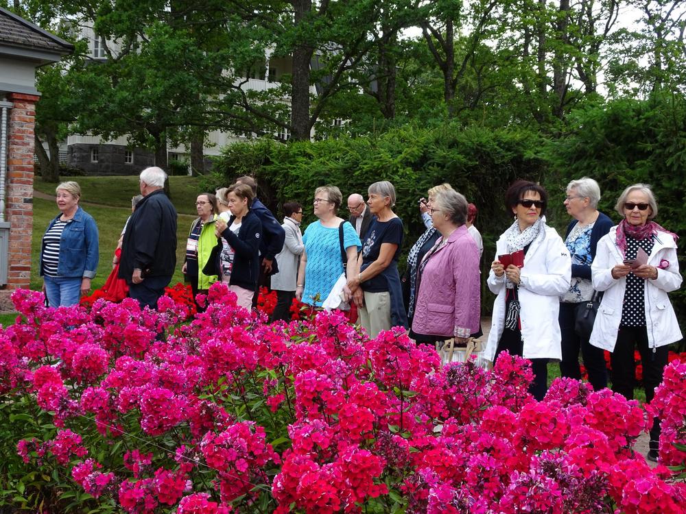 Seuraava etappimme oli Kultarannan puutarha. Presidentti ei ollut kotona, mutta puutarha hehkui täydessä loistossaan. Kiertokävelyn aikana saimme paljon tietoa Kultarannan historiasta sekä niskaamme reippaan sadekuuron. Sateesta viis, sillä silmänruokaa kyllä riitti!