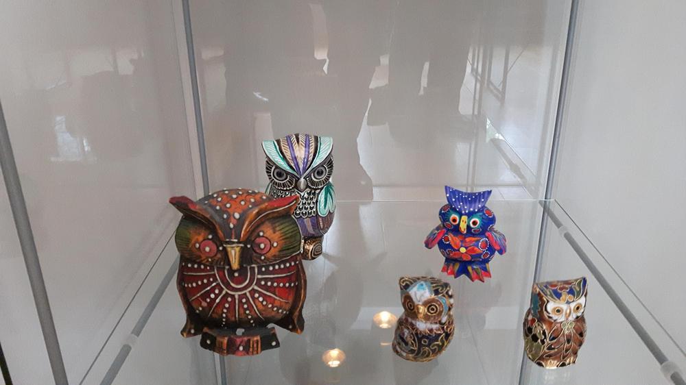 Kotkan seniorien jäsenen Riitta Relander-Horon yksityiskokoelmasta on järjestetty taidenäyttely-kiehtovat pöllöt.Kuvat: Eeva G
