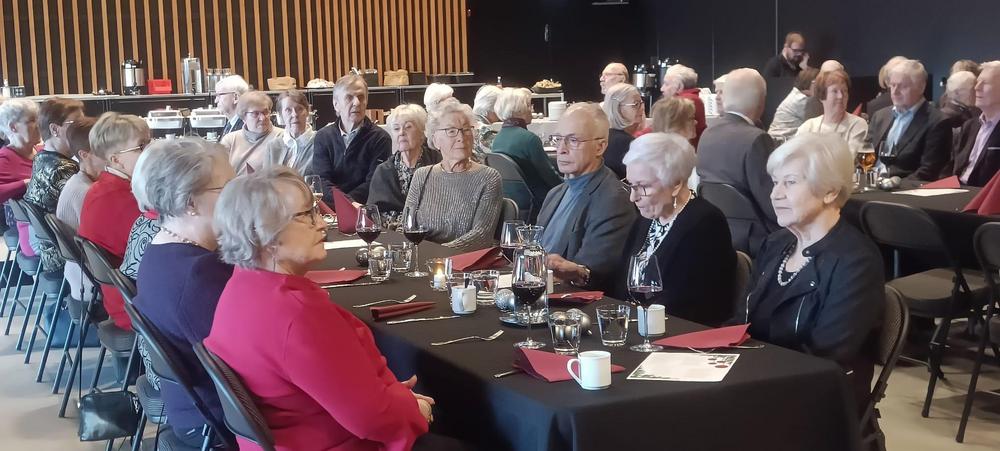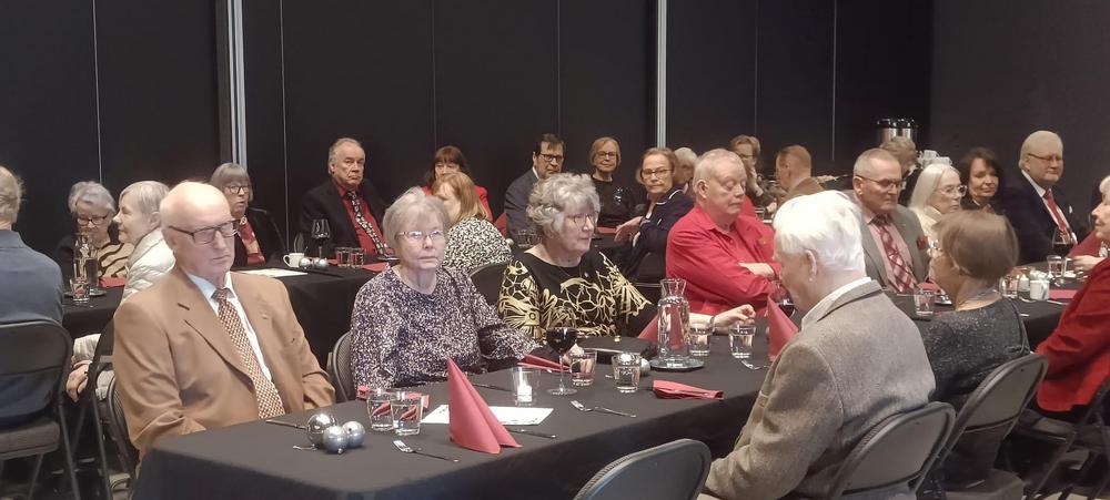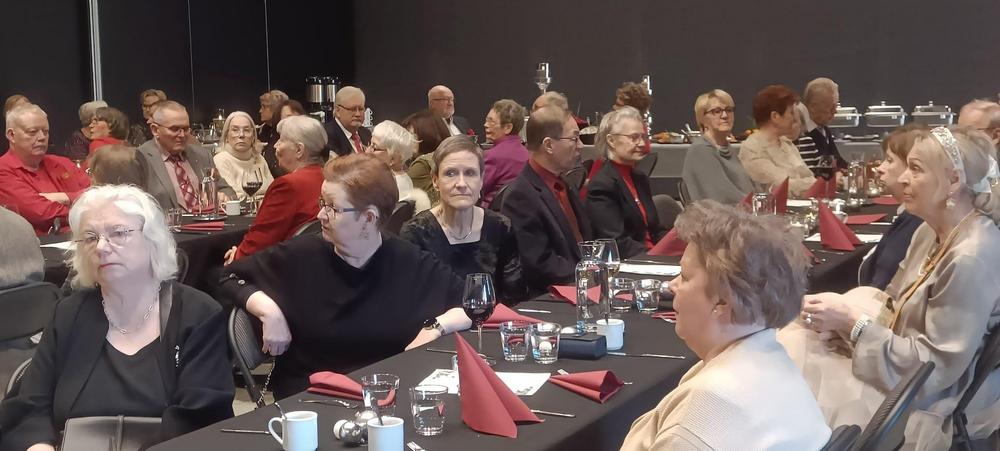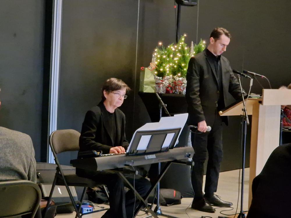 Joululounas syötiin, kuten viime vuonnakin, Satama Areenan toisen kerroksen juhlatilassa. Lounaan järjestelyt toimivat hyvin ja ruoka maittoi. Ruokailun lomassa meille esiintyivät ukrainalainen laulaja Ruslan Dishkant säestäjänään kanttori Pia Hemminki. Myös muutama joululaulu laulettiin yhteisvoimin.