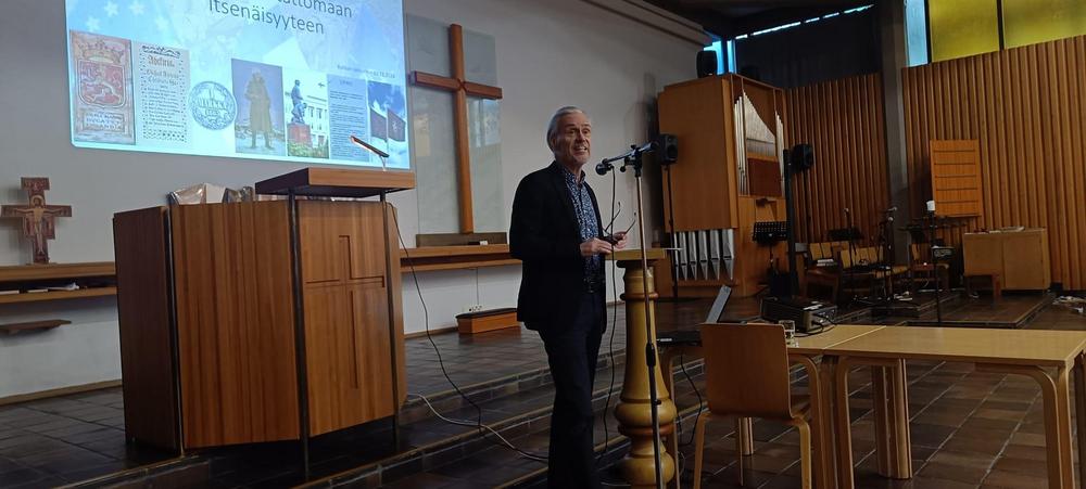 Kuukausitapaamisessa meille esitelmöi Kotkan kaupunginhallituksen varapuheenjohtaja, eversti evp. Jouko Rauhala aiheenaan ” Suomen kansan tarina”.