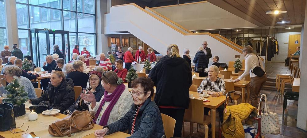 Joulumyyjäisissä joulupuuro, kahvi ja torttu maistuivat. Tupa oli täynnä iloista seniori-ikäistä väkeä. Arvat tekivät kauppansa, samoin mehut ja hillot.