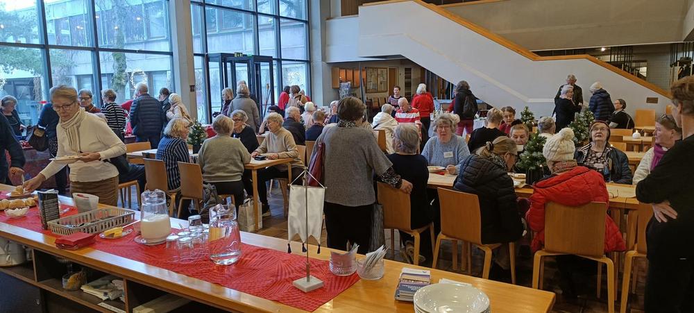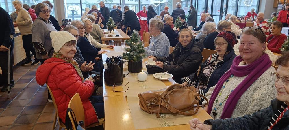 Joulumyyjäisissä joulupuuro, kahvi ja torttu maistuivat. Tupa oli täynnä iloista seniori-ikäistä väkeä. Arvat tekivät kauppansa, samoin mehut ja hillot.