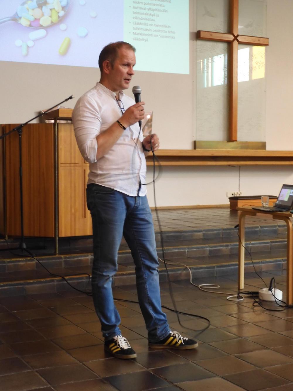 Apteekkari Mika Kaaja kertoi lääkkeiden ja luontaistuotteiden yhteisvaikutuksesta ja yhteensopivuudesta.