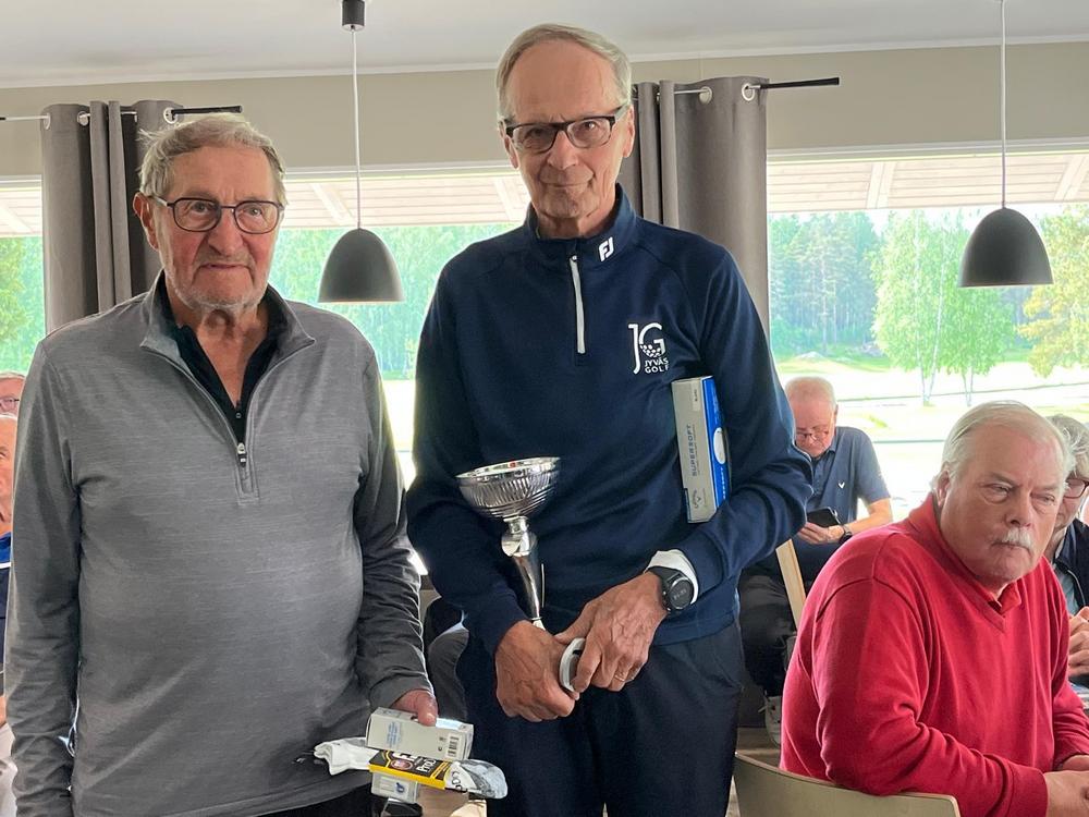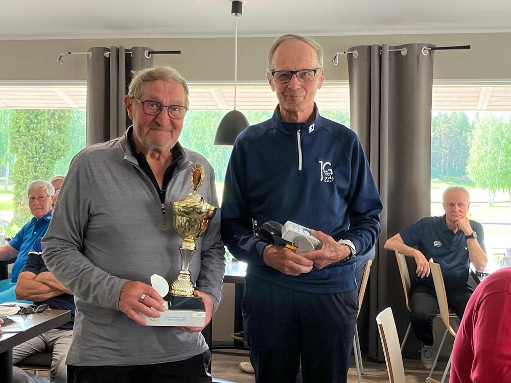Kotkan senioreiden varapuheenjohtaja Pekka Heikkilä sekä kilpailunjohtajana toiminut, Kotkan senioreiden netti- ja somevastaava Heikki Illiminsky hoitivat palkintojenjaon.